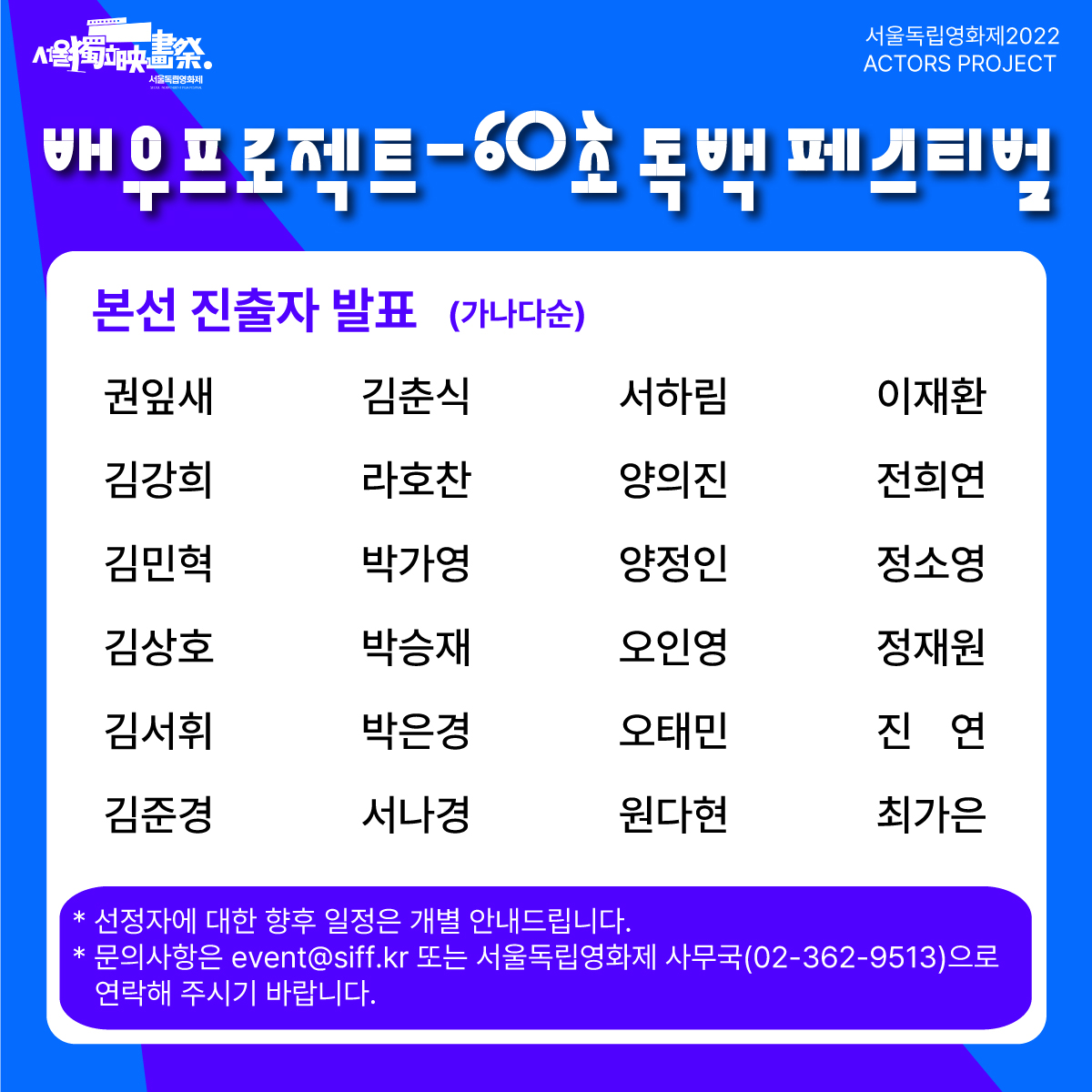 * 문의사항은 event@siff.kr 혹은 사무국(02-362-9513)으로 연락 주시기 바랍니다. (문의시간: 평일 11:00~18:00)